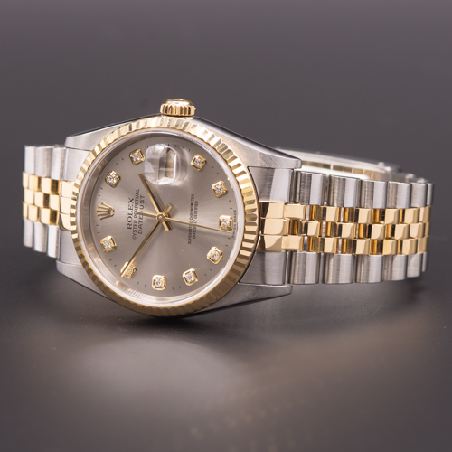 A Steel And 18ct Yellow Gold 36mm Cased Datejust With A Fluted Bezel And Jubilee Bracelet. The Watch Is Supplied With Grey Diamond Dot Dial. With The Trend For Larger Watches Makes The 36mm Case Popular For Both Ladies And Gents.